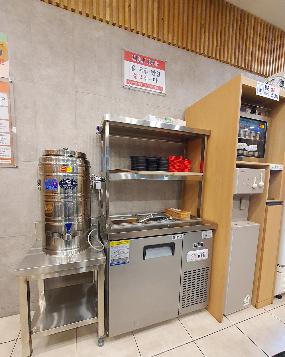 셀프코너에서 물, 국물, 반찬, 유아식기 등을 가져 올 수 있어요.