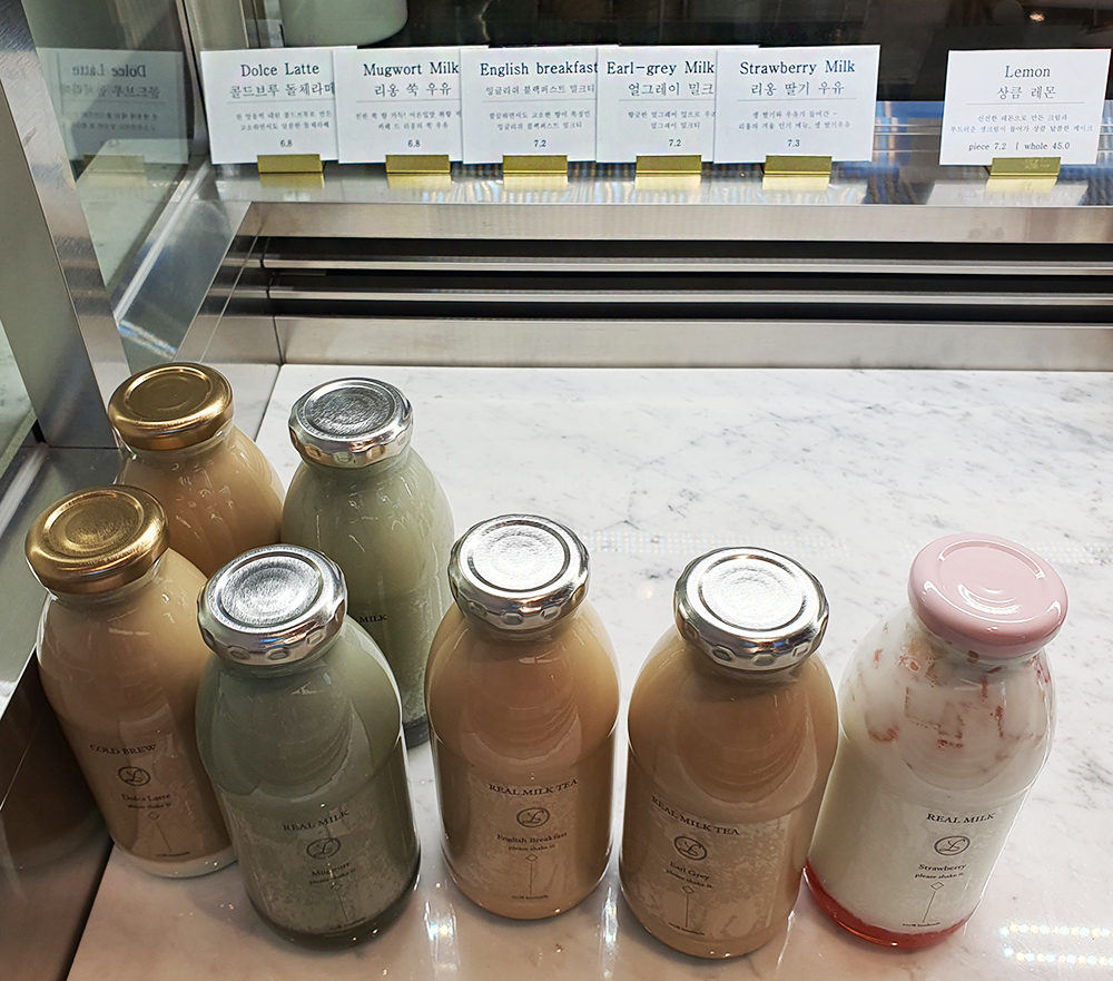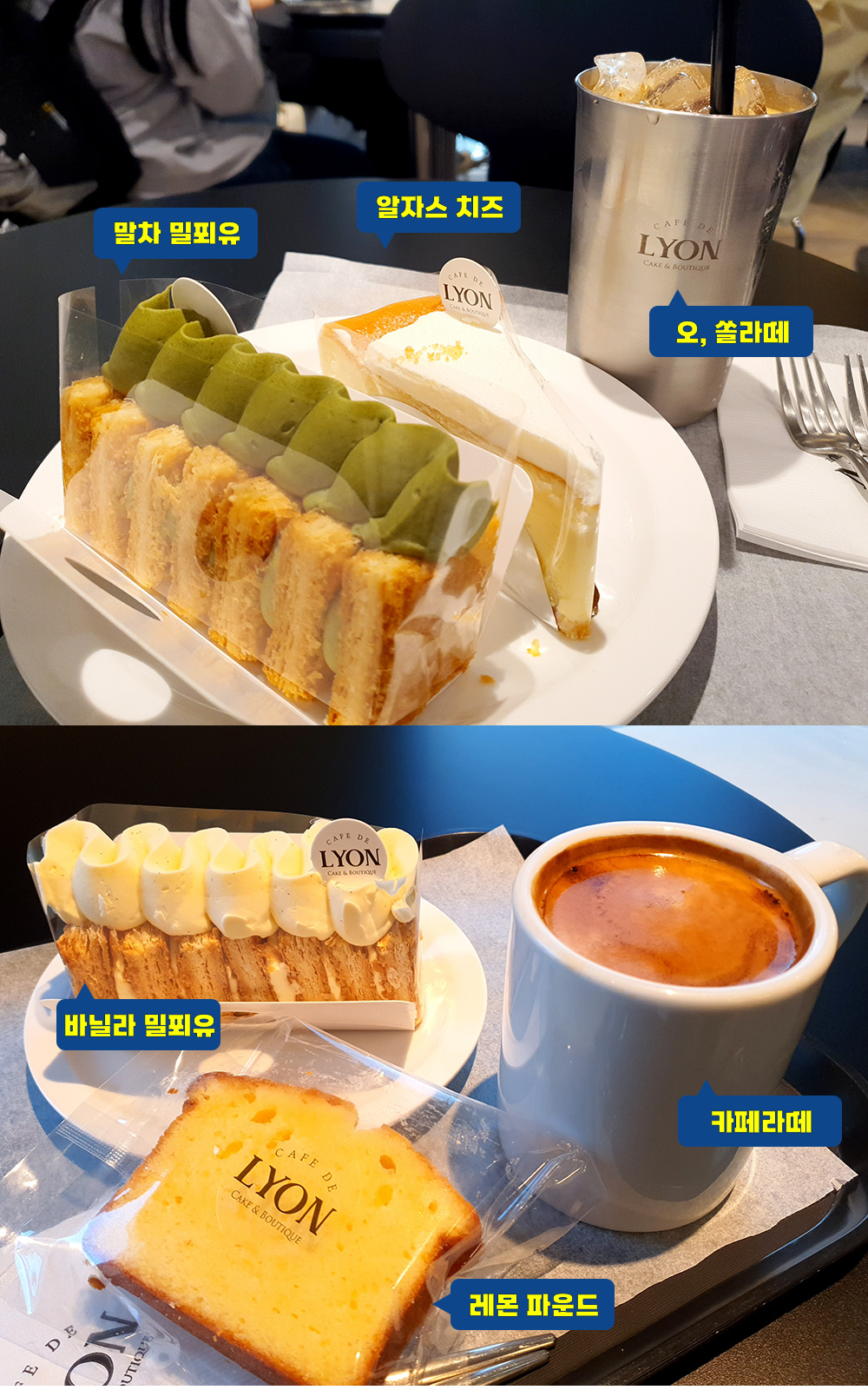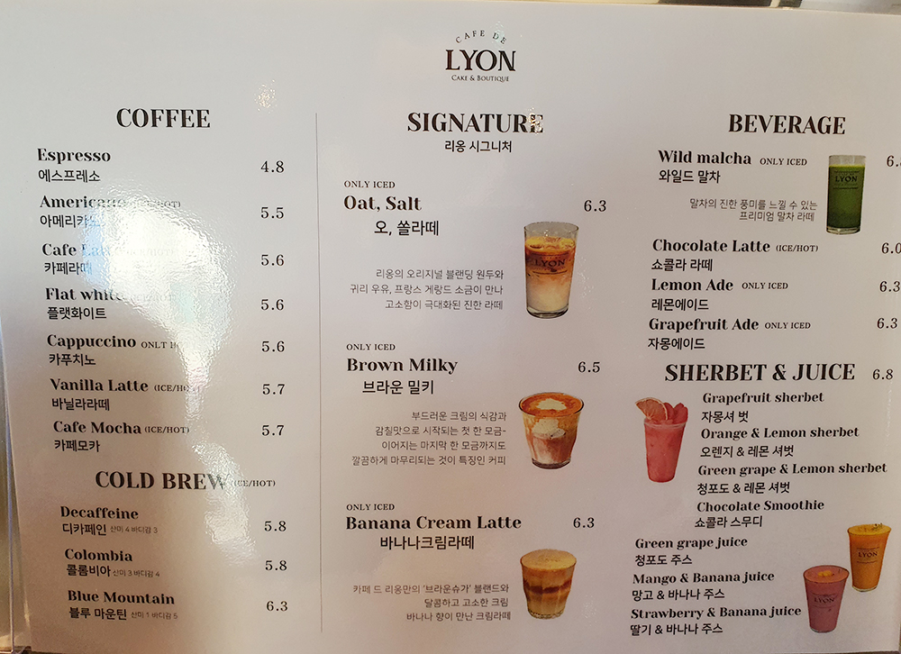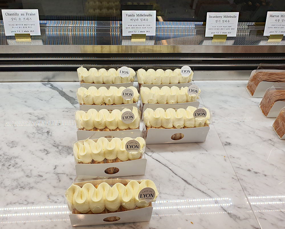 딸기 밀푀유 7,500원 / 바닐라 밀푀유 7,200원 / 브라운밀키 6,500원 / 오 쏠 라떼 6,300원