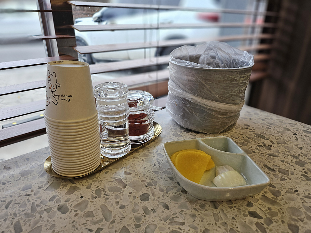 셀프코너에 단무지, 가위, 앞치마 등이 있으니 편하게 이용할 수 있습니다.
