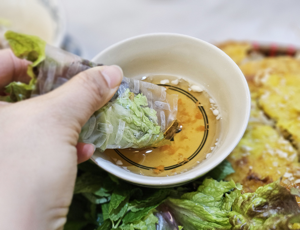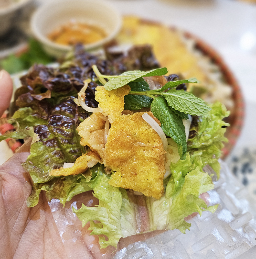 그 위에 반쎄오를 말아 소스에 찍어 먹는거래요.