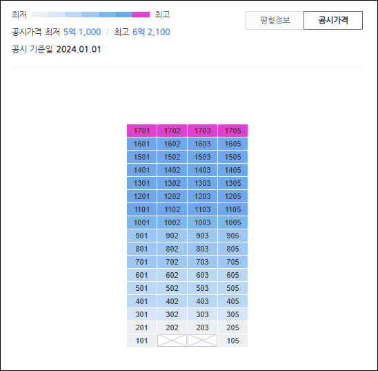 아파트 공시가격처럼 중층부터 탑층 아래가 높은 가격을 형성하고 있습니다.